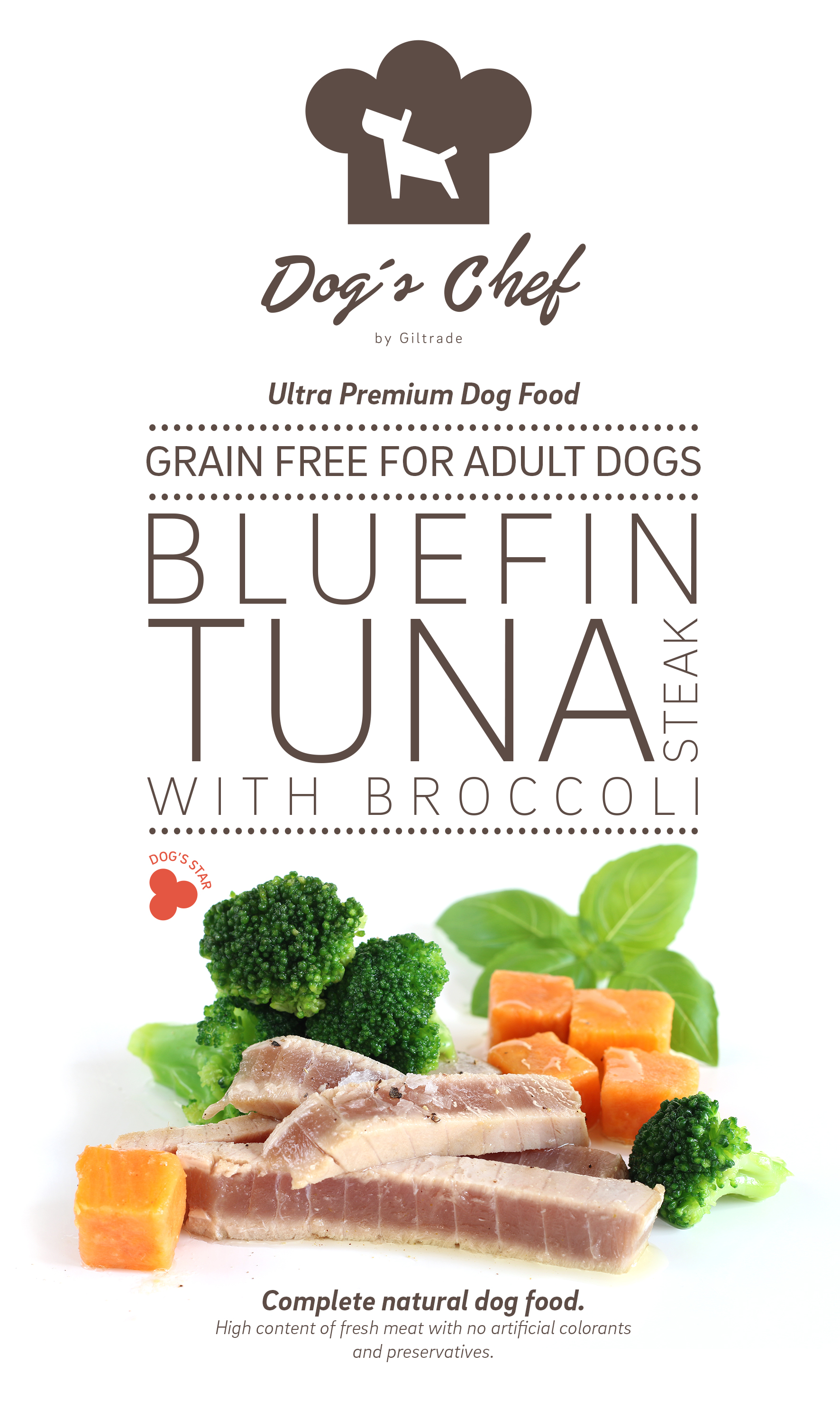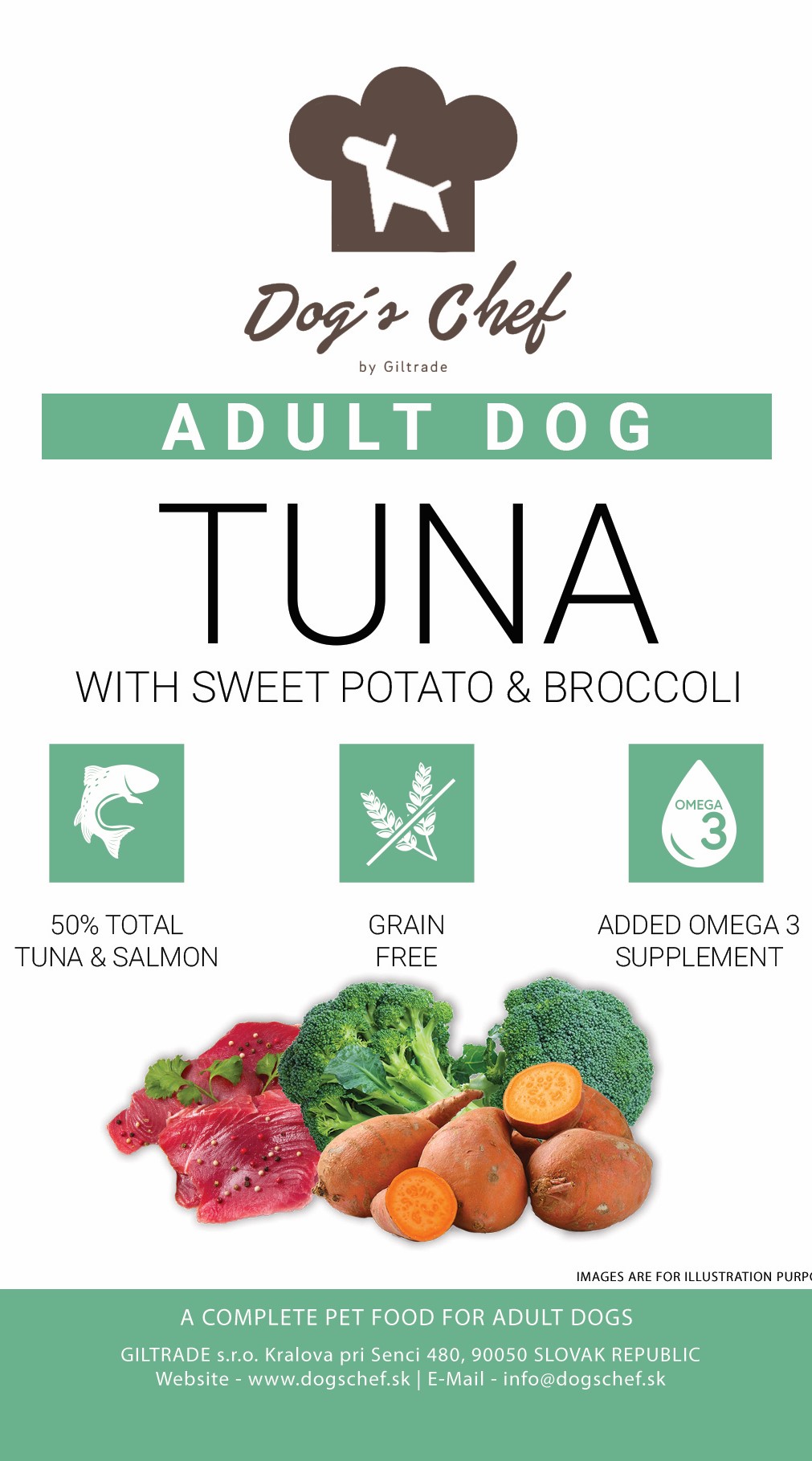 Tuňák a Losos 50% (čerstvě připravený tuňák 26%, sušený losos 19%, lososový olej 3% a vývar z lososa 2%), Sladké brambory (24%), Brambory, Hrášek (9%), Lněná semínka, Řepná dřeň, Minerály, Doplněk Omega 3, Brokolice, Fruktooligosacharidy FOS (96 mg/kg), Mananoligosacharidy MOS (24 mg/kg).