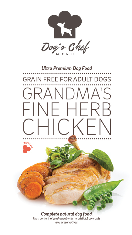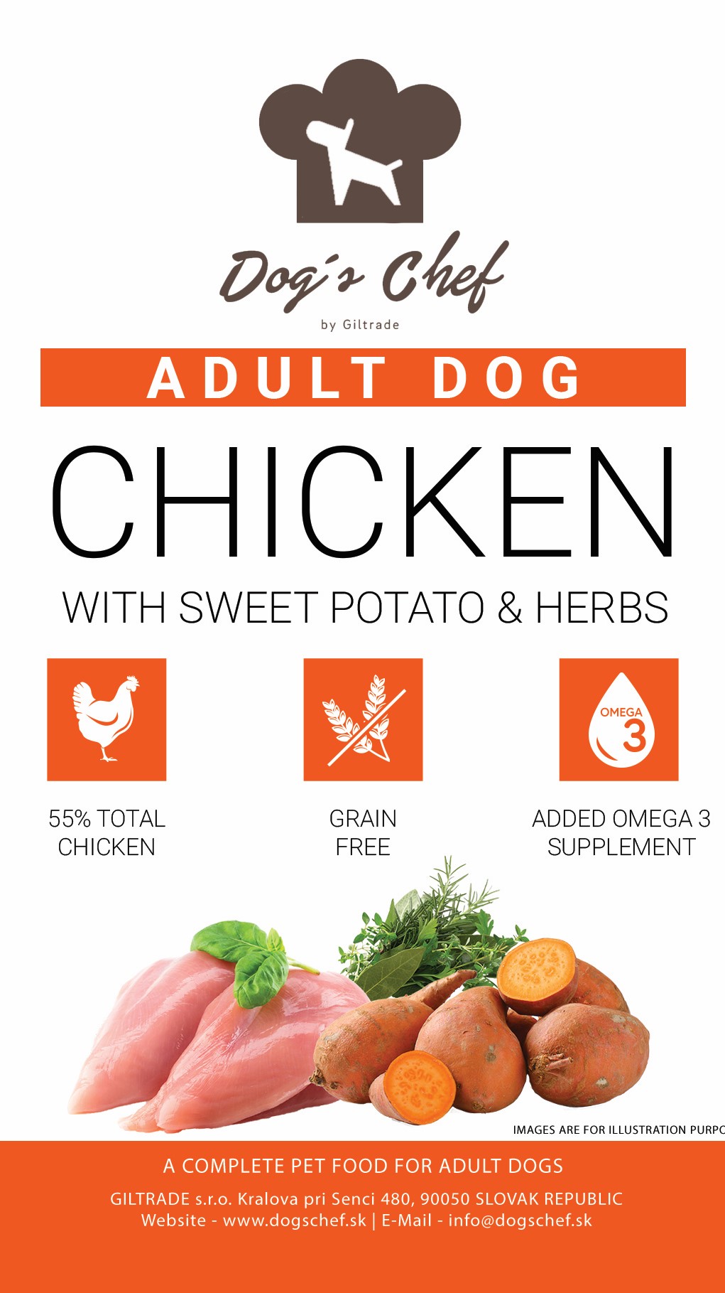 Kuře 55% (čerstvé kuřecí maso 31%, sušené kuřecí maso 21% a kuřecí vývar 3%), Sladké brambory (26%), Hrášek (6%), Brambory, Řepná dřeň, Lněná semínka, Doplněk Omega 3, Minerály, Majoránka, Bazalka, Oregano, Šalvěj, Tymián, Petržel, Fruktooligosacharidy FOS (96 mg/kg), Mananoligosacharidy MOS (24 mg/kg).
