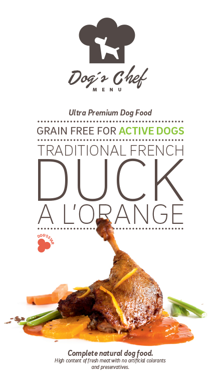 Kachna 65% (čerstvě připravené kachní maso 35%, sušené kachní maso 22%, kachní tuk 5%, kachní vývar 3%), Sladké brambory, Fazole, Řepná dřeň, Pastinák, Červená řepa, Pomeranč, Chřest, Dýně, Minerály, Fruktooligosacharidy FOS (175 mg/kg), Mananoligosacharidy MOS (50 mg/kg), Extrakt z oliv.