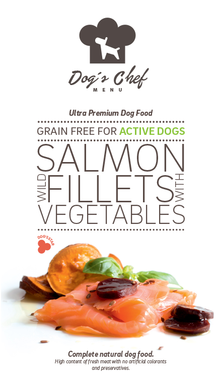 Losos 65% (čerstvě připravený losos 35%, sušený losos 23%, lososový olej 4%, vývar z lososa 3%), Sladké brambory, Fazole, Řepná dřeň, Kopr, Špenát, Fenykl, Chřest, Doplněk Omega 3, Minerály, Fruk FOS (192 mg/kg), Mananoligosacharidy MOS (48 mg/kg), Extrakt z oliv.