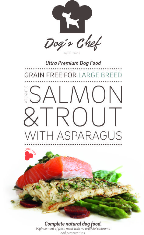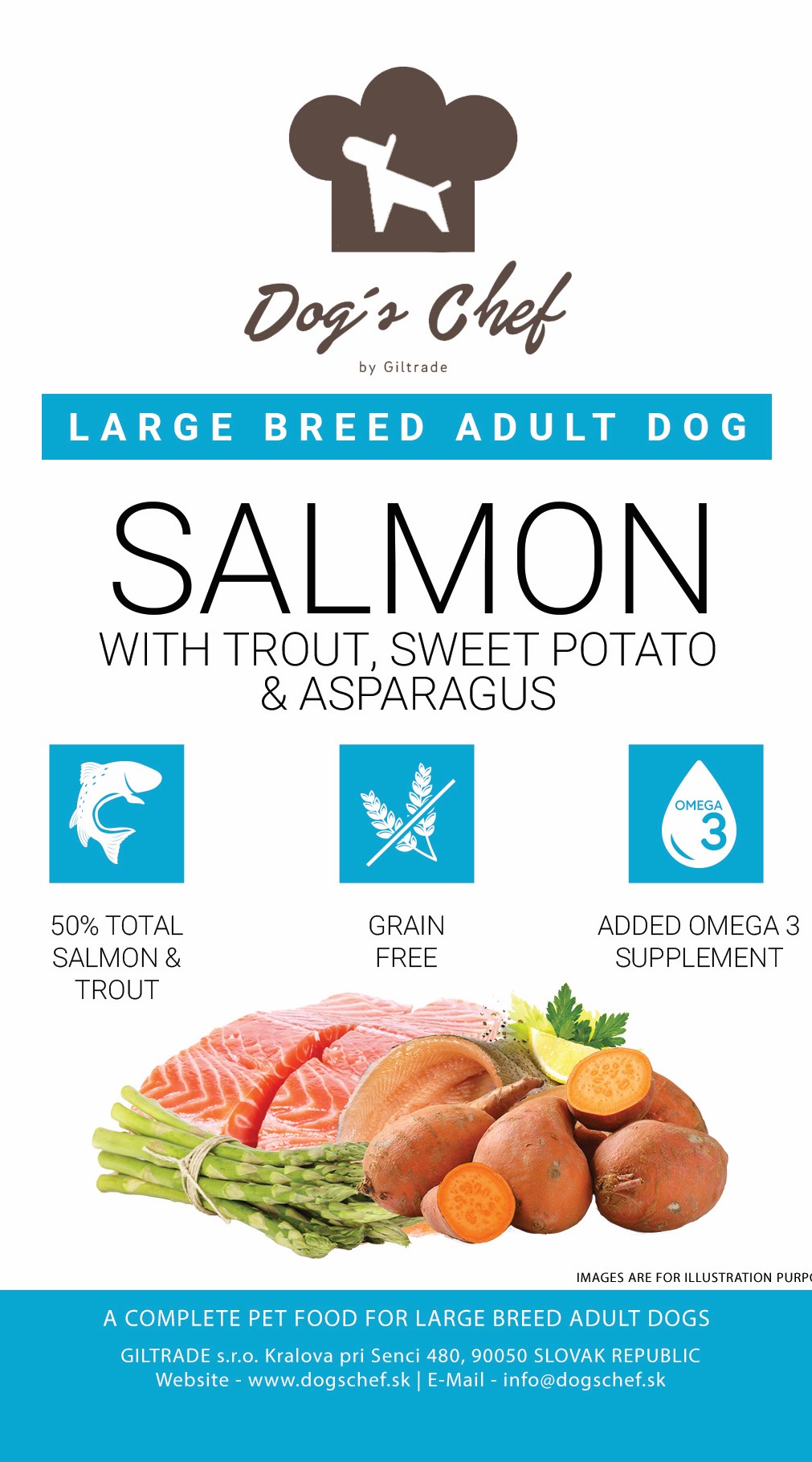 Losos a Pstruh 50% (čerstvě připravený losos a pstruh 33%, sušený losos 15%, vývar z lososa 2%), Sladké brambory (24%), Hrášek (9%), Brambory, Řepná dřeň, Lněná semínka, Doplněk Omega 3 , Minerály, Chřest, Glukosamín (170 mg/kg), Metylsulfonylmetán - MSM (170 mg/kg), Chondroitín sulfát (125 mg/kg), Fruktooligosacharidy FOS (96 mg/kg), Mananoligosacharidy MOS (24 mg/kg).