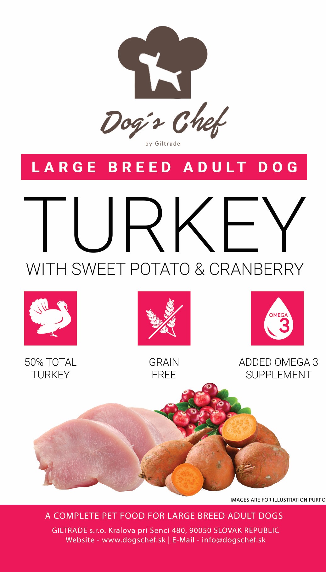 Krůta 50% (čerstvě připravené krůtí maso 28%, sušené krůtí maso 18%, krůtí tuk 2%, krůtí vývar 2%), Sladké brambory (24%), Hrášek (7%), Brambory, Řepná dřeň, Hrachová bílkovina, Bramborová bílkovina, Doplněk Omega 3, Lněná semínka, Minerály, Brusinky, Glukosamín (170 mg/kg), Metylsulfonylmetán - MSM (170 mg/kg), Chondroitín sulfát (125 mg/kg), Fruktooligosacharidy FOS (96 mg/kg), Mananoligosacharidy MOS (24 mg/kg).