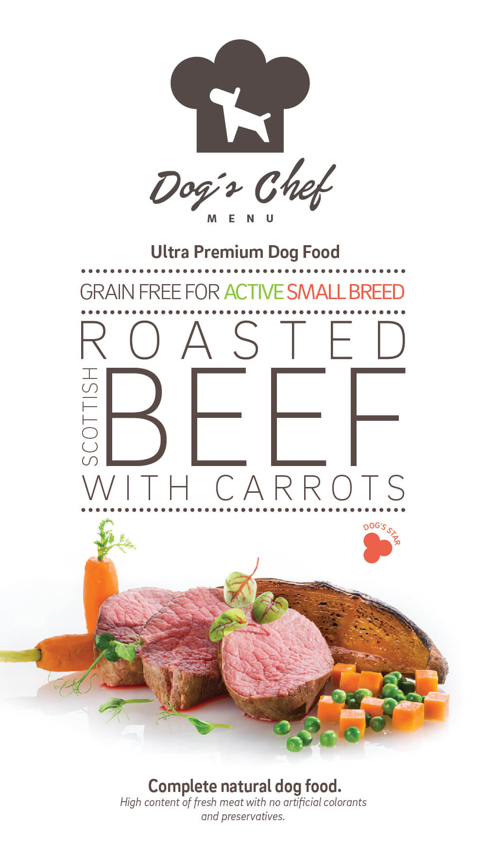 Hovězí 65% (čerstvě připravené hovězí maso 35%, sušené hovězí maso 25%, hovězí tuk 5%), Sladké brambory, Fazole, Řepná dřeň, Mrkev, Zelená fazolka, Květák, Cuketa, Rajčata, Doplněk Omega 3, Minerály, Glukosamin (178 mg/kg), Metylsulfonylmetan - MSM (178 mg/kg), Fruktooligosacharidy FOS (175mg/kg), Chondroitin sulfát (125 mg/kg), Mananoligosacharidy MOS (50 mg/kg), Extrakt z oliv.